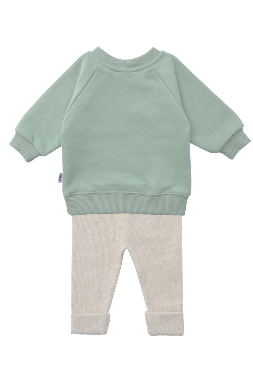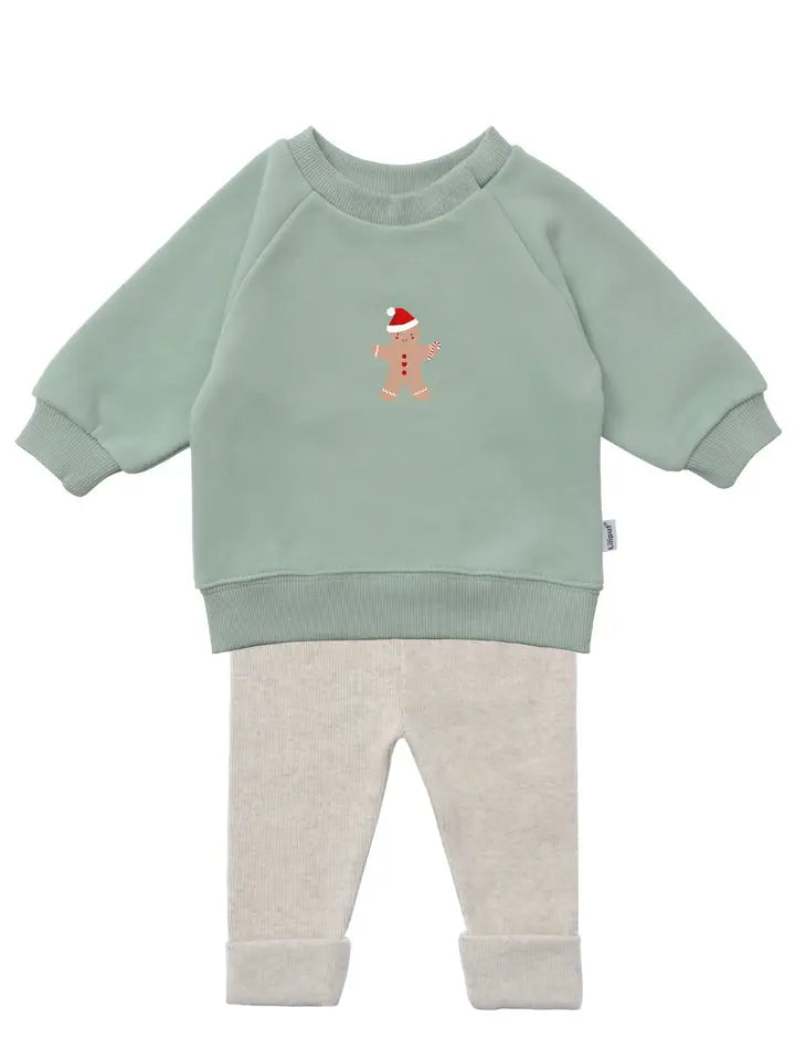 Heerlijk kerstsetje! Het setje bestaat uit een fijn sweatshirt in groen met het peperkoekmannetje op de borst. Bij de kleinere maten bevinden zich twee verborgen drukknoopjes bij de halslijn, waardoor de opening voor het hoofd kan worden vergroot om het aan te trekken. Deze drukknoopjes verdwijnen bij de grotere maten. De mouwen hebben ook elastische ribboorden die geen kou binnenlaten. Dankzij de katoenmix is de trui lekker warm en aangenaam zacht op de huid.