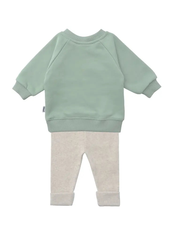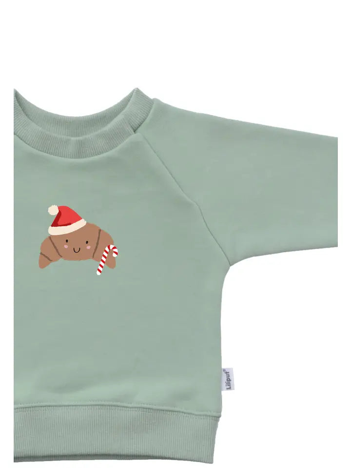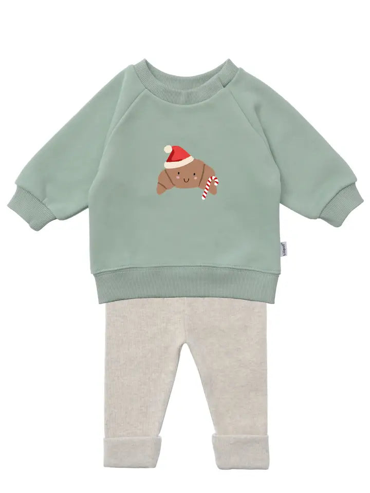 Een heerlijk kerstsetje! Het setje bestaat uit een fijn sweatshirt in groen met een croissant, zuurstokje en kerstmuts op de borst. Bij de kleinere maten bevinden zich twee verborgen drukknoopjes bij de halslijn, waardoor de opening voor het hoofd kan worden vergroot om het aan te trekken. Deze drukknoopjes verdwijnen bij de grotere maten. De mouwen hebben ook elastische ribboorden die geen kou binnenlaten. Dankzij de katoenmix is de trui lekker warm en aangenaam zacht op de huid.