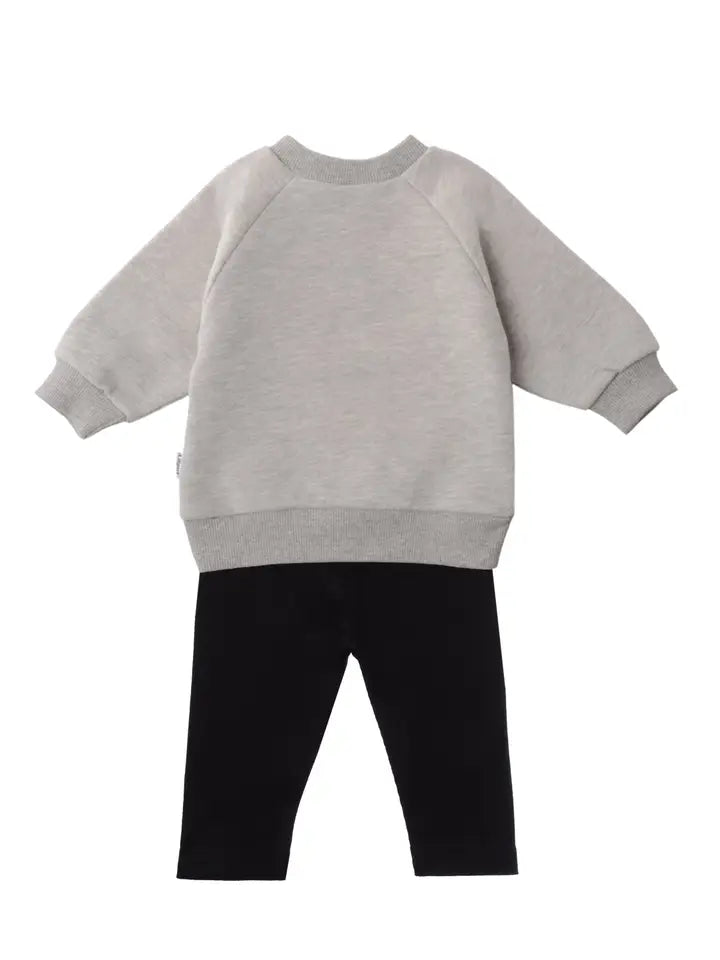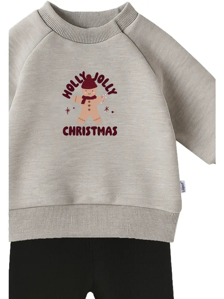 Een heerlijk kerstsetje! Het setje bestaat uit een fijn sweatshirt in grijs met een kerstig peperkoekmannetje op de borst. Bij de kleinere maten bevinden zich twee verborgen drukknoopjes bij de halslijn, waardoor de opening voor het hoofd kan worden vergroot om het aan te trekken. Deze drukknoopjes verdwijnen bij de grotere maten. De mouwen hebben ook elastische ribboorden die geen kou binnenlaten. Dankzij de katoenmix is de trui lekker warm en aangenaam zacht op de huid.