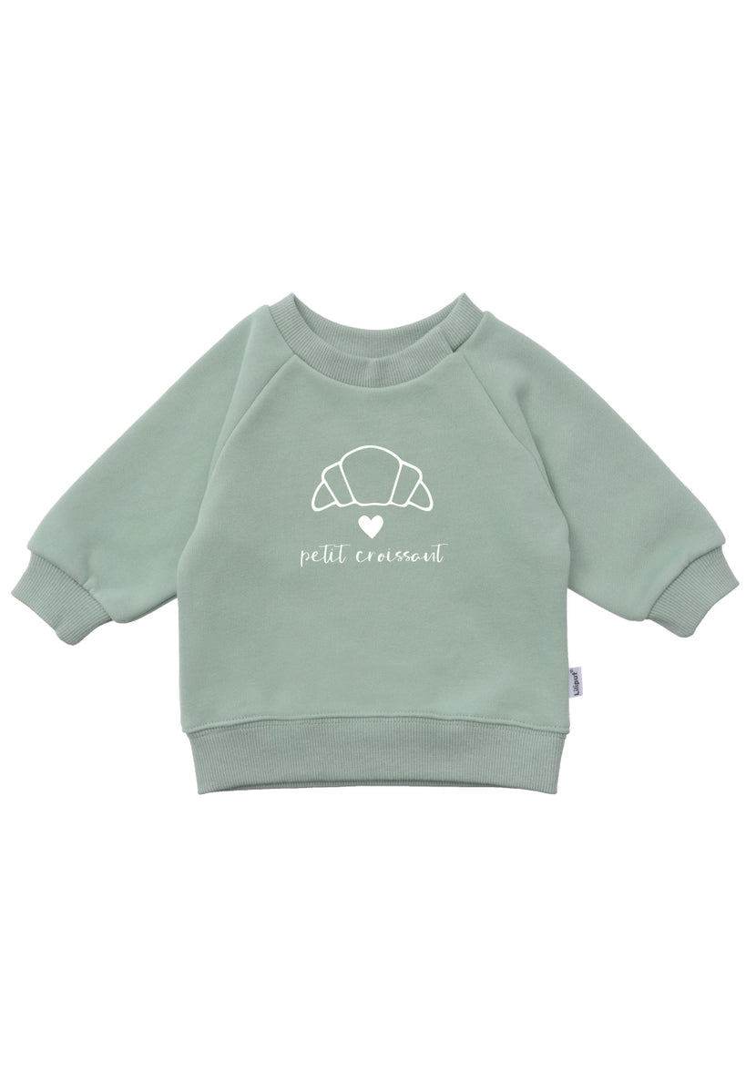 Fijn sweatshirt in groen met schattige "Petit Croissant" print. Bij de maten 86/92 & 98/104 bevinden zich twee verborgen drukknoopjes bij de halslijn, waardoor de opening voor het hoofd kan worden vergroot om het aan te trekken. Deze drukknoopjes verdwijnen bij de grotere maten. De mouwen hebben ook elastische ribboorden die geen kou binnenlaten. Dankzij de katoenmix is de trui lekker warm en aangenaam zacht op de huid.
