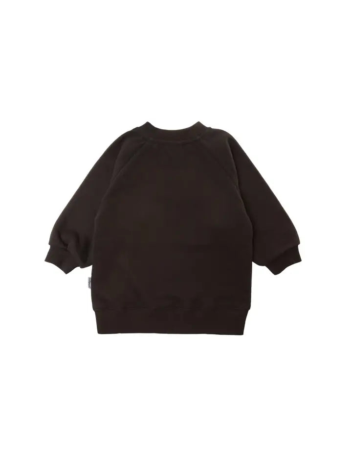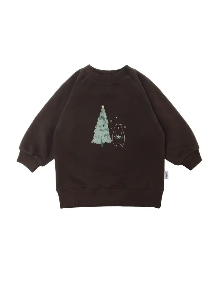Een heerlijk, knuffelzachte sweatshirt in donkerbruin met een schattige ijsbeer naast een kerstboom. Er zijn elastische ribboorden aan de mouwen. Dankzij de katoenmix is de trui aangenaam zacht op de huid. Voor de maat 74/80 zijn er twee verborgen drukknoopjes op de halslijn, die kunnen worden gebruikt om de hoofduitsparing te vergroten zodat deze over het hoofd kan worden getrokken. Deze drukknopjes verdwijnen bij de grotere maten.