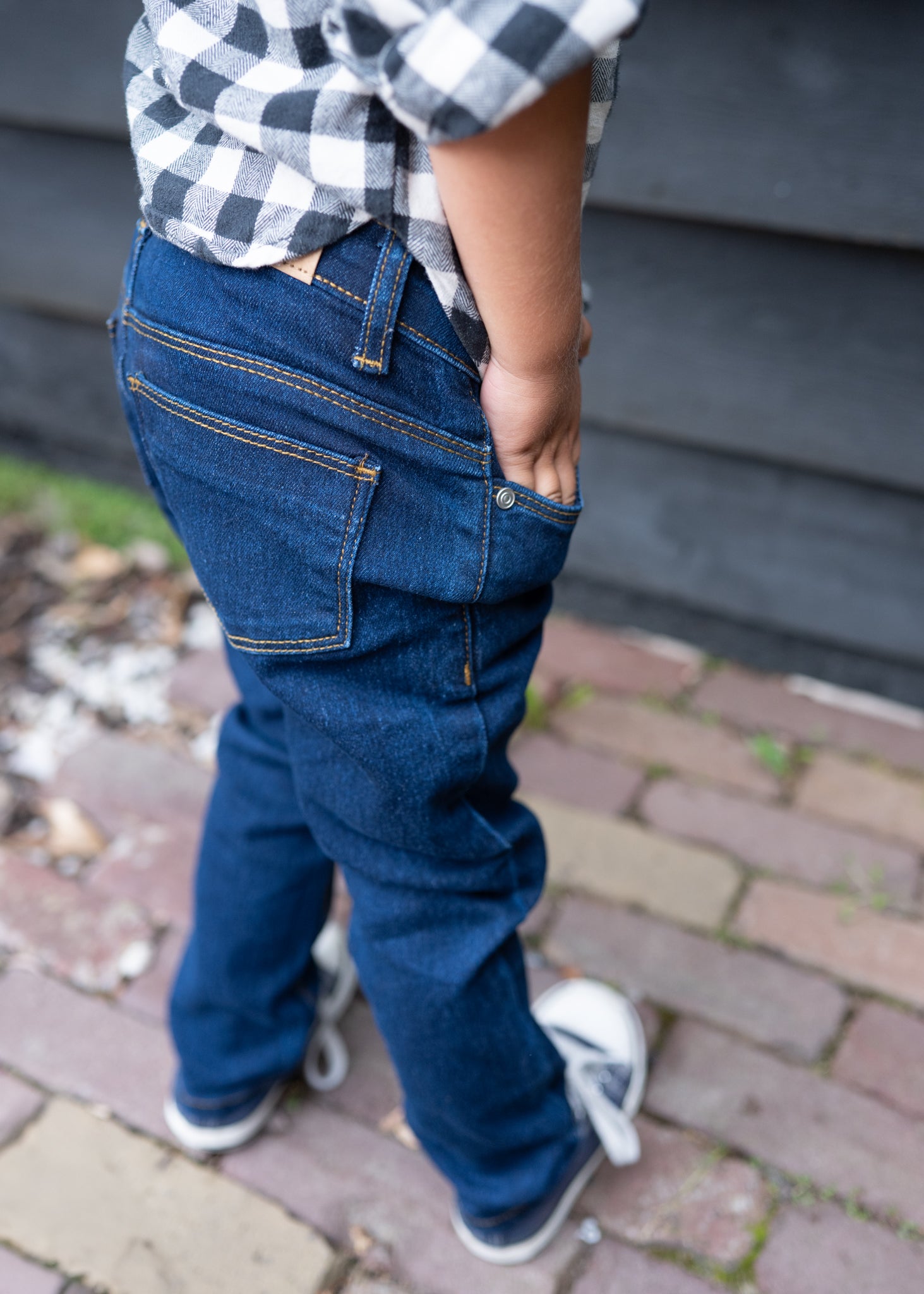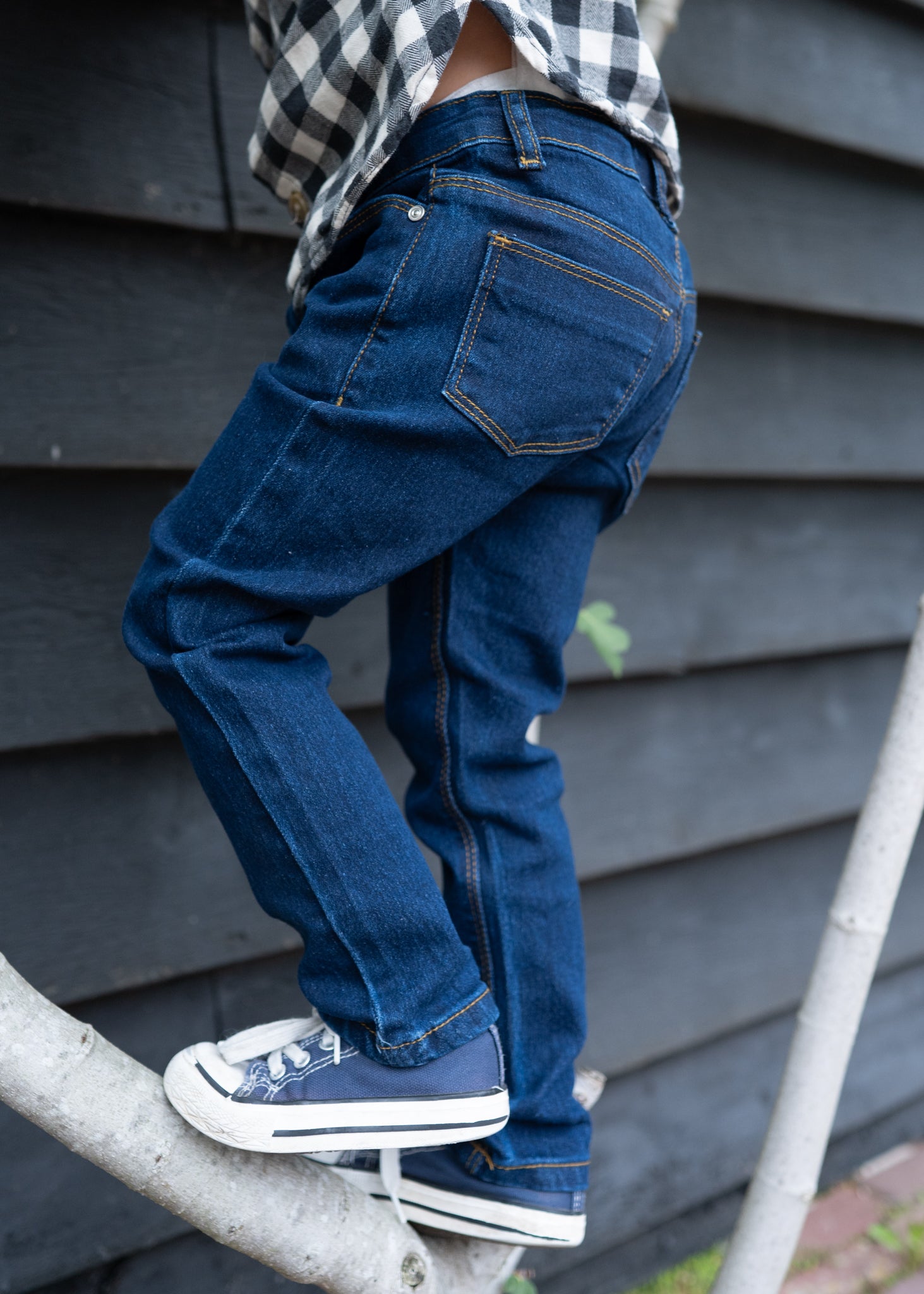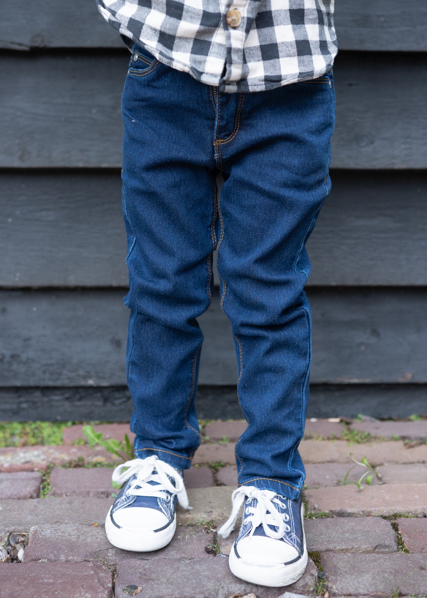 Leuke donkerblauwe spijkerbroek die is gemaakt van katoen, polyester & elastaan, met verstelbaar elastiek aan de binnenkant van de taille. De broek valt wat smaller, dus ideaal voor de jongens die de lengte in zijn geschoten, maar in de breedte nog niet echt. De sluiting aan de voorkant bestaat uit een rits en knoop. Doordat de broek wat elastaan bevat, heeft het een fijne stretch.